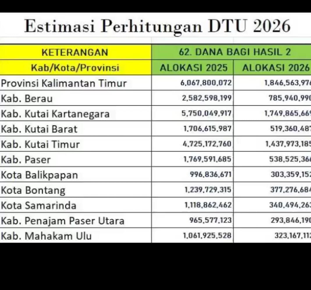 Berdasarkan data yang pihaknya terima, total dana transfer ke Bontang pada 2026 turun dibandingkan 2025. Bila dikalkulasi, kata Neni, pendapatan asli daerah (PAD), Dana alokasi umum (DAU), dan bantuang keuangan (Bankeu) sekitar Rp2,1 triliun. Padahal asumsi APBD Bontang 2026 diproyeksi mencapai Rp2,8 triliun.