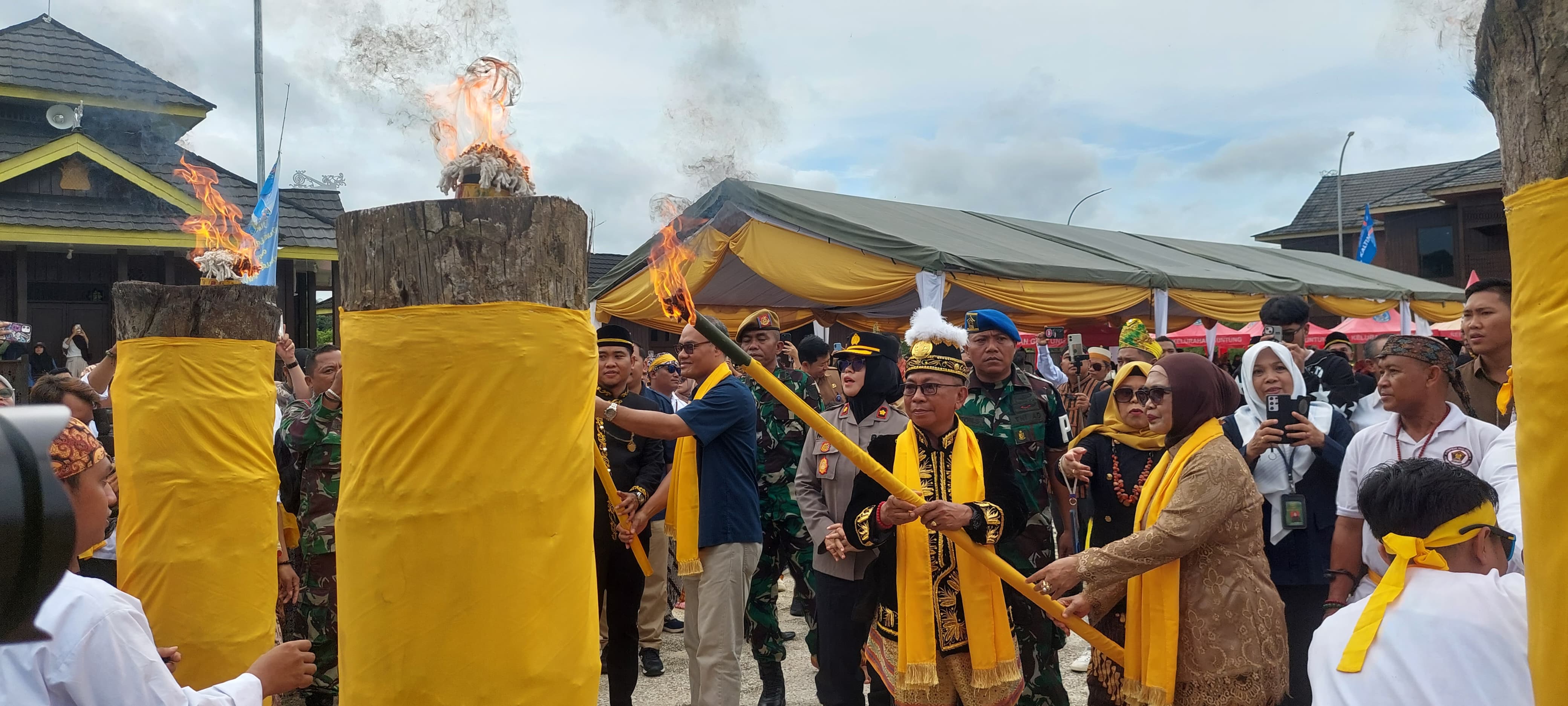 Kaltimtoday.co, Bontang - Dinyalakannya 'brong' atau obor sakral menandai dibukanya Erau Pelas Benua di Kampong Adat Guntung, Bontang, Selasa (18/11/2025) pagi. Upacara adat dan festival budaya adat khas Kutai ini diusulkan masuk kalender event nasional untuk di Bontang.