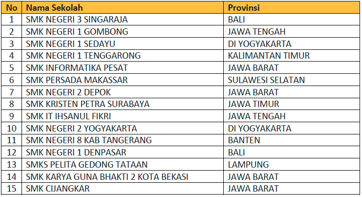 Berdasarkan pengumuman finalis yang dilakukan secara daring pada tanggal 4 Oktober 2023, lima belas SMK yang berhasil masuk babak final adalah: