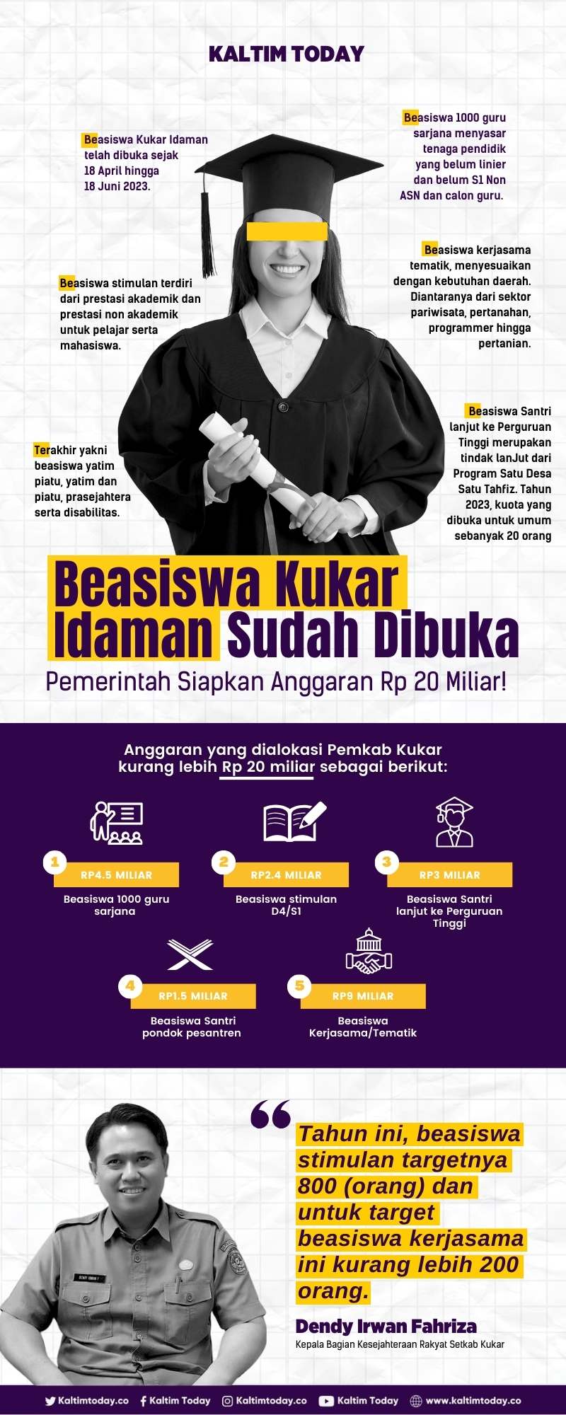 Kaltimtoday.co, Tenggarong - Beasiswa Kukar Idaman telah dibuka sejak 18 April hingga 18 Juni 2023. Pemerintah Kabupaten (Pemkab) Kutai Kartanegara telah mengalokasikan anggaran kurang lebih Rp 20 miliar.