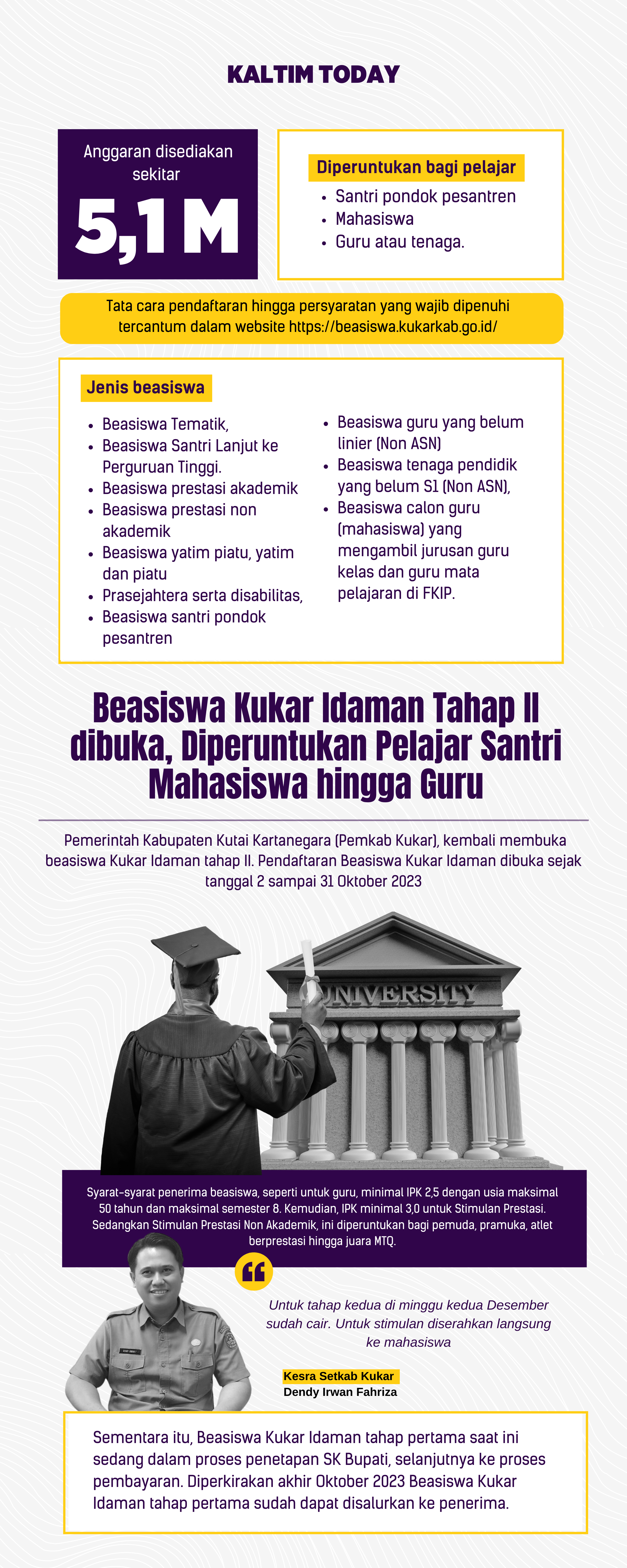 Tata cara pendaftaran hingga persyaratan yang wajib dipenuhi tercantum dalam website https://beasiswa.kukarkab.go.id/. pendidik dan calon guru.