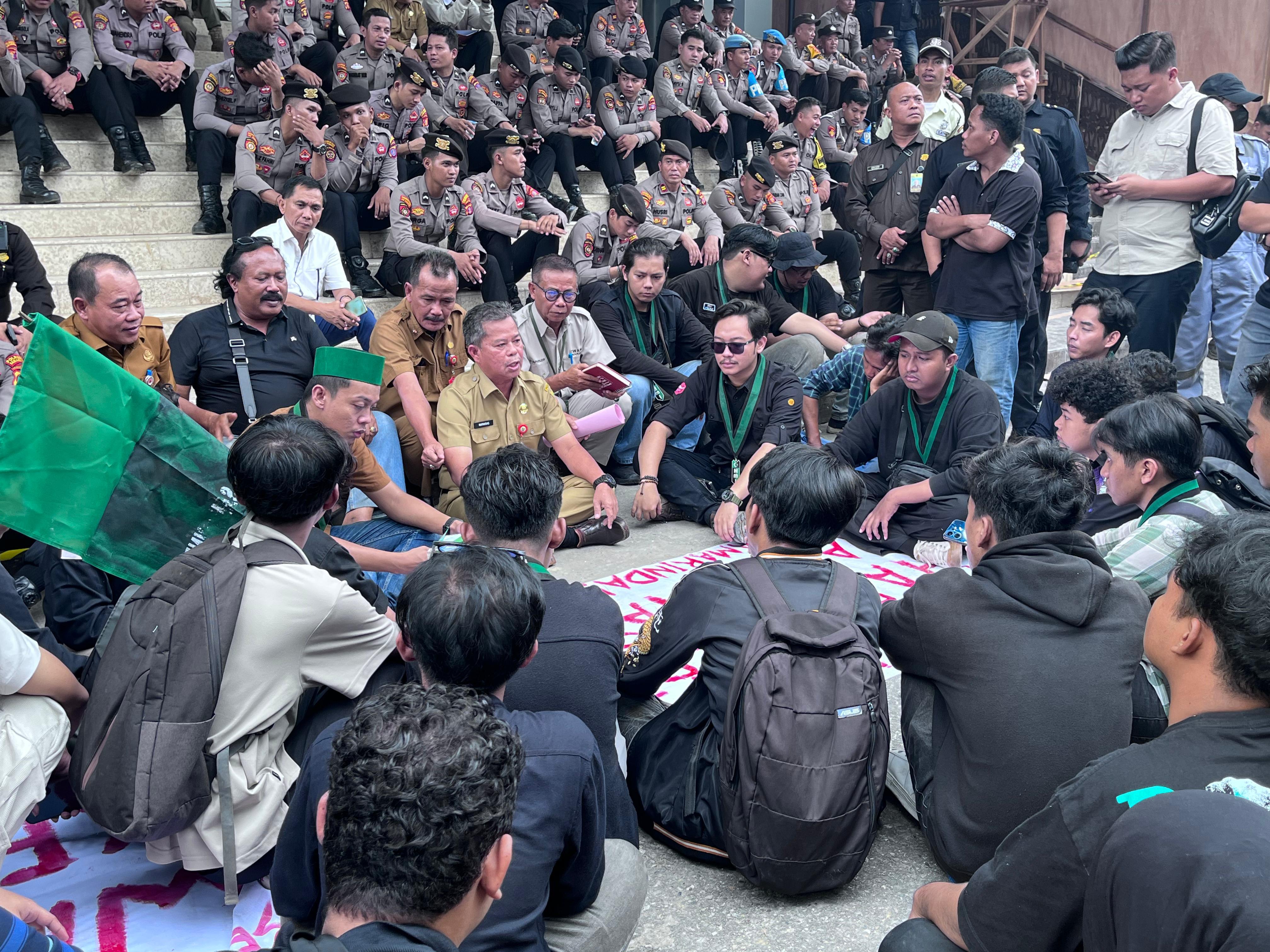 Aksi kembali berjalan kondusif setelah Asisten II Setda Kota Samarinda Marnabas Patiroy duduk bersama untuk menerima tuntutan massa aksi di lapangan.
