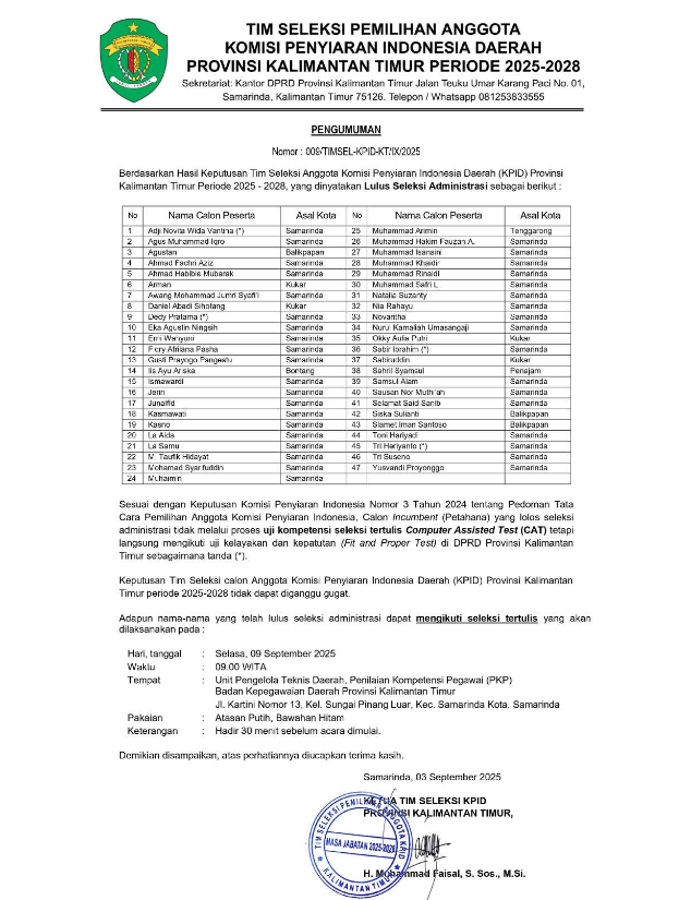 Kaltimtoday.co, Samarinda - Seleksi calon anggota Komisi Penyiaran Indonesia Daerah (KPID) Kalimantan Timur periode 2025–2028 terus berlanjut. Tim Seleksi (Timsel) resmi mengumumkan hasil tahap administrasi, dengan 47 peserta dinyatakan lolos dari total 55 pendaftar.