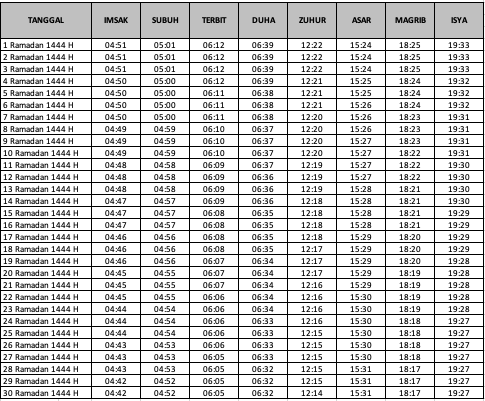 Bagi Anda yang tinggal di Kutai Kartanegara (Kukar), jadwal imsak 1-30 Ramadan 1444 H adalah sebagai berikut: