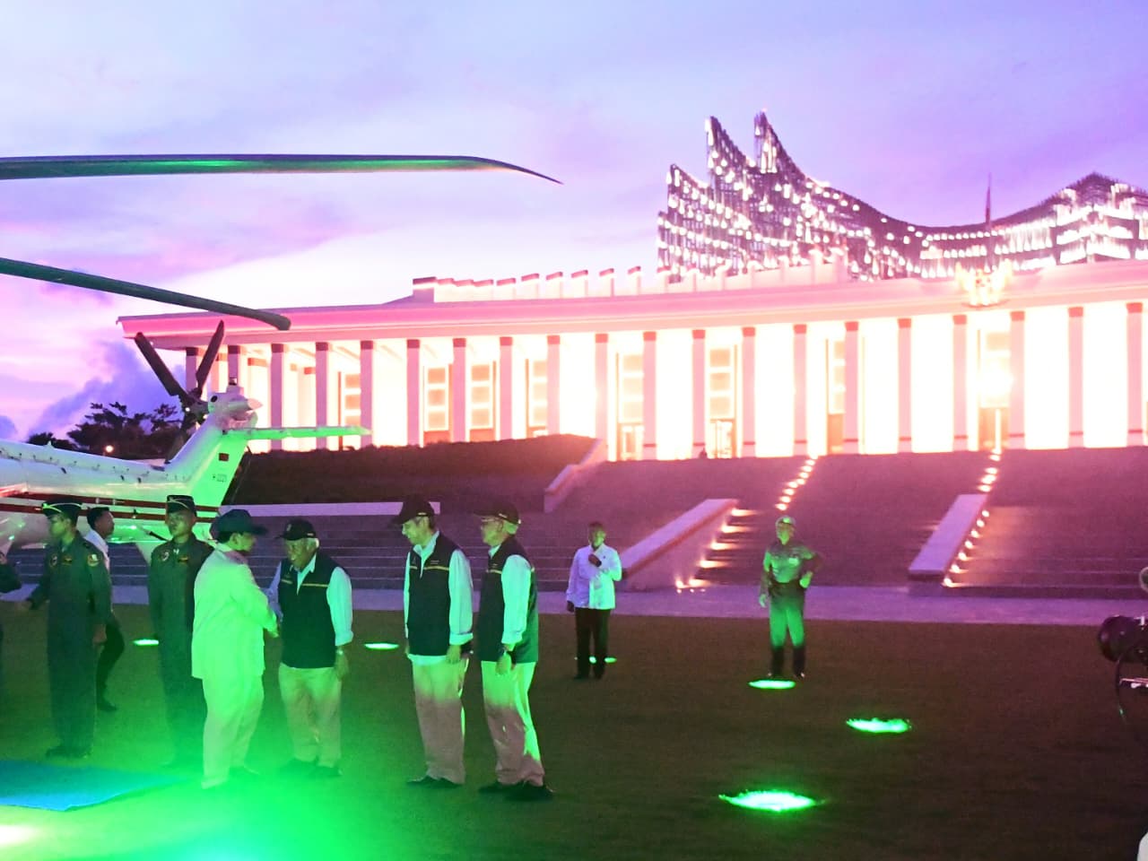 Menjelang senja dia mendarat persis di depan Istana Garuda. Pemandangannya jadi sangat menarik dengan lampu warna-warni yang menghiasi Istana. Prabowo sempat berkomentar rumput yang diinjaknya. “Ini rumput beneran atau apa? Bagus sekali,” katanya saat disambut Kepala Otorita IKN, Basuki Hadimuljono.