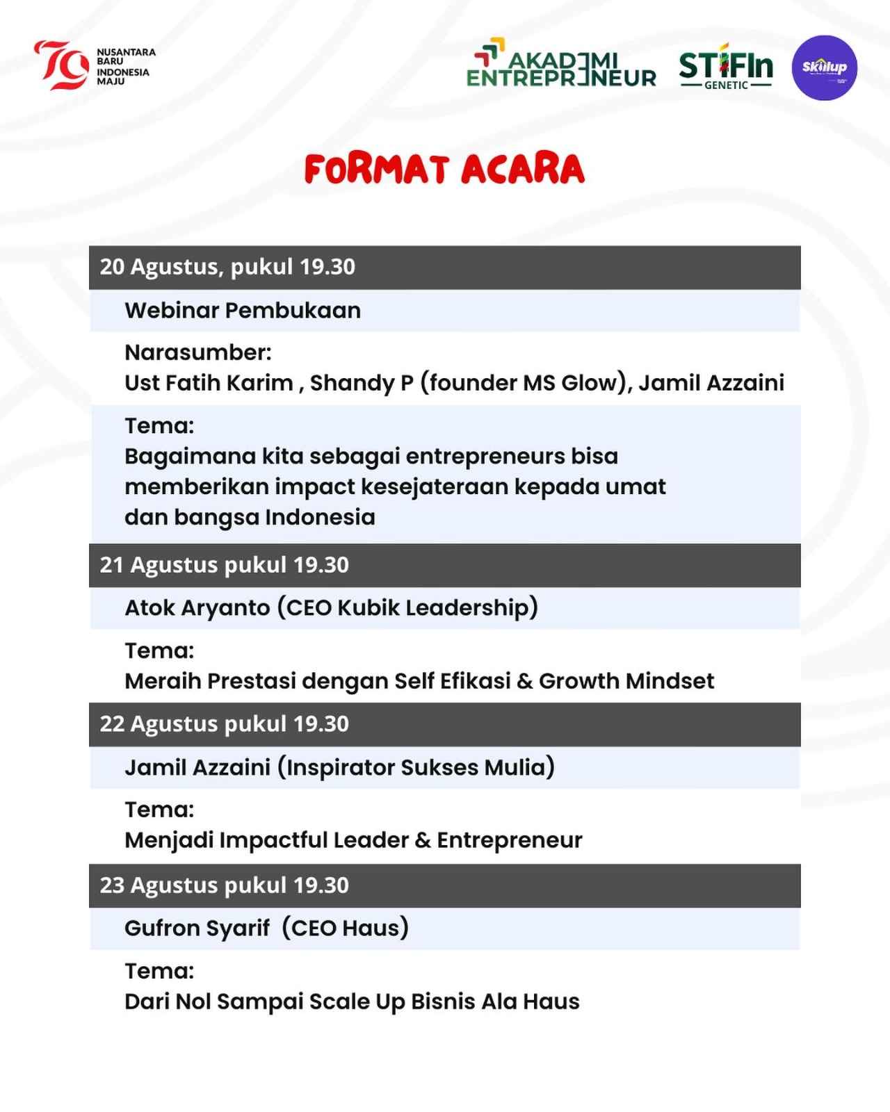 Dalam Webinar “Creative Entrepreneurs Indonesia Maju”, akan hadir berbagi ilmu para pengusaha muda hebat antara lain CEO Haus Gufron Syarif yang dalam enam tahun sudah memiliki 200 cabang dan 600 gerobak keliling Haus. Ada juga pendiri MS Glow Shandy Purnama Sari yang kini bisnisnya tidak cuma skincare tapi sudah merambah ke mana-mana termasuk bisnis transportasi.