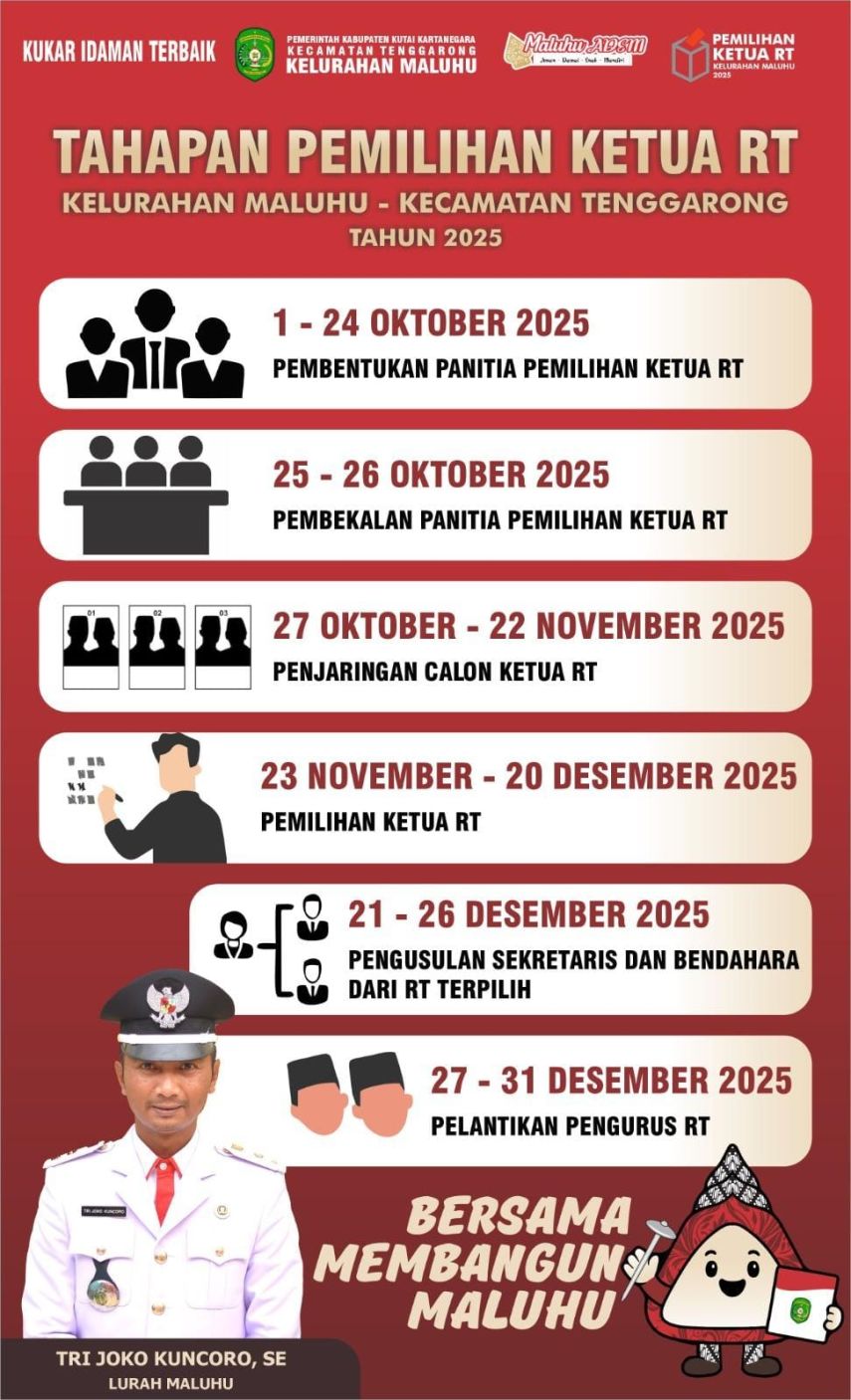 Lurah Maluhu, Tri Joko Kuncoro menyampaikan, tahapan sudah dimulai sejak awal Oktober dengan agenda pembentukan panitia pemilihan Ketua RT. Panitia berjumlah lima orang dan dipilih dari pengurus RT yang ada, dengan syarat tidak boleh berasal dari pengurus RT saat ini maupun calon Ketua RT, demi menjaga netralitas.