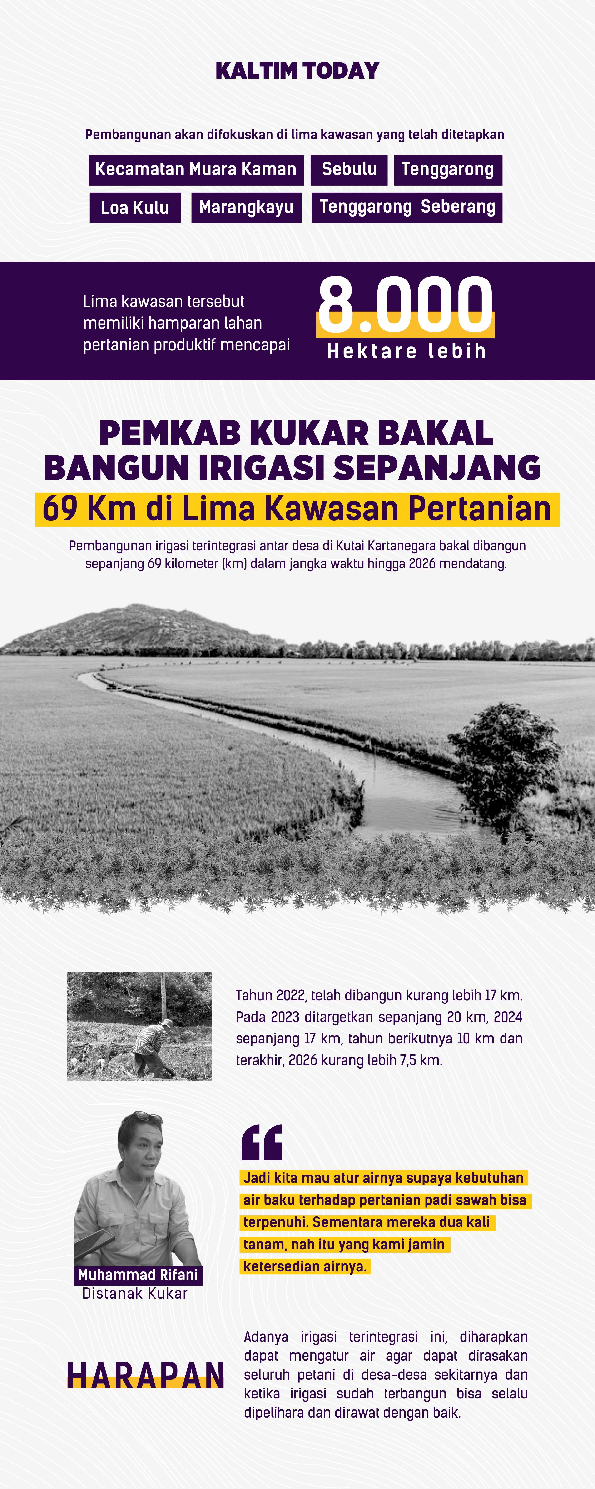 Kaltimtoday.co, Tenggarong - Pembangunan irigasi terintegrasi antar desa di Kutai Kartanegara bakal dibangun sepanjang 69 kilometer (km) dalam jangka waktu hingga 2026 mendatang.