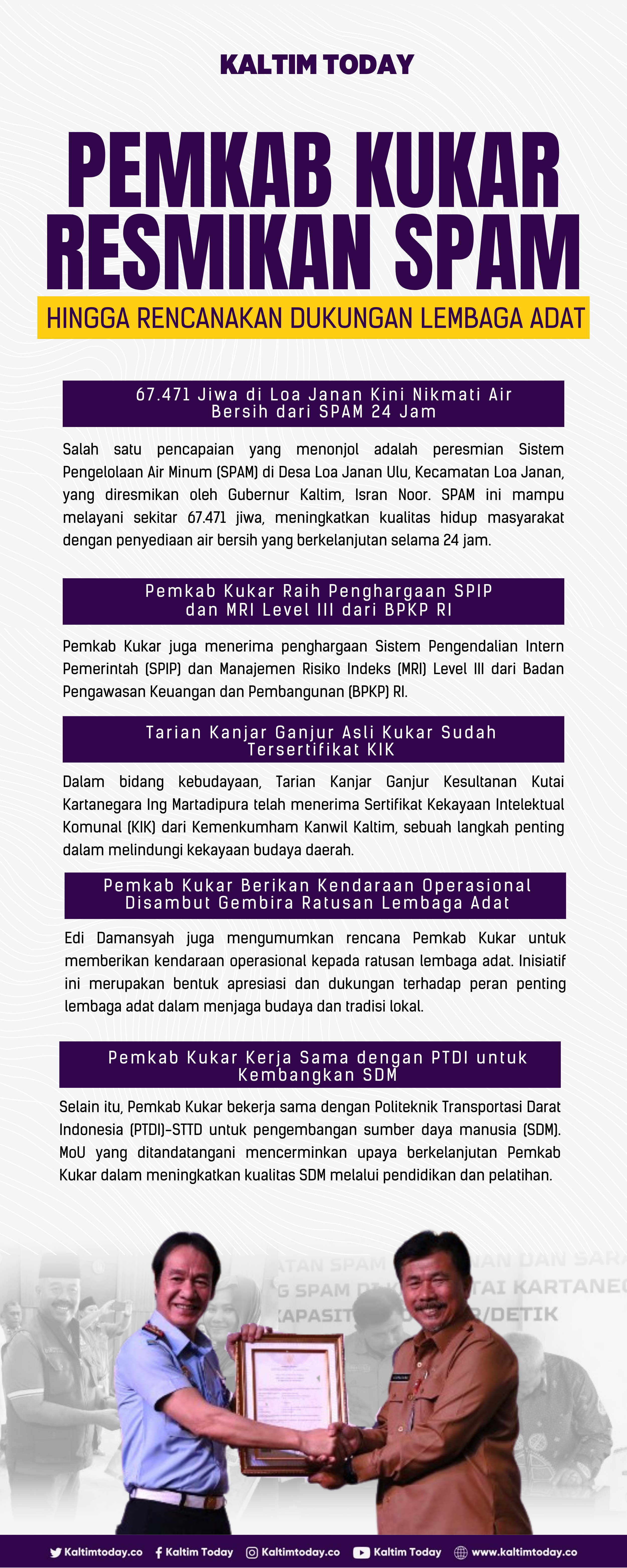 Kaltimtoday.co, Tenggarong - Pemerintah Kabupaten Kutai Kartanegara (Pemkab Kukar) telah meraih berbagai pencapaian penting di Juni 2023, termasuk penghargaan dari BPKP RI dan sertifikasi budaya asli dari Kemenkumham. Semua itu terangkum sepanjang bulan Juni 2023.