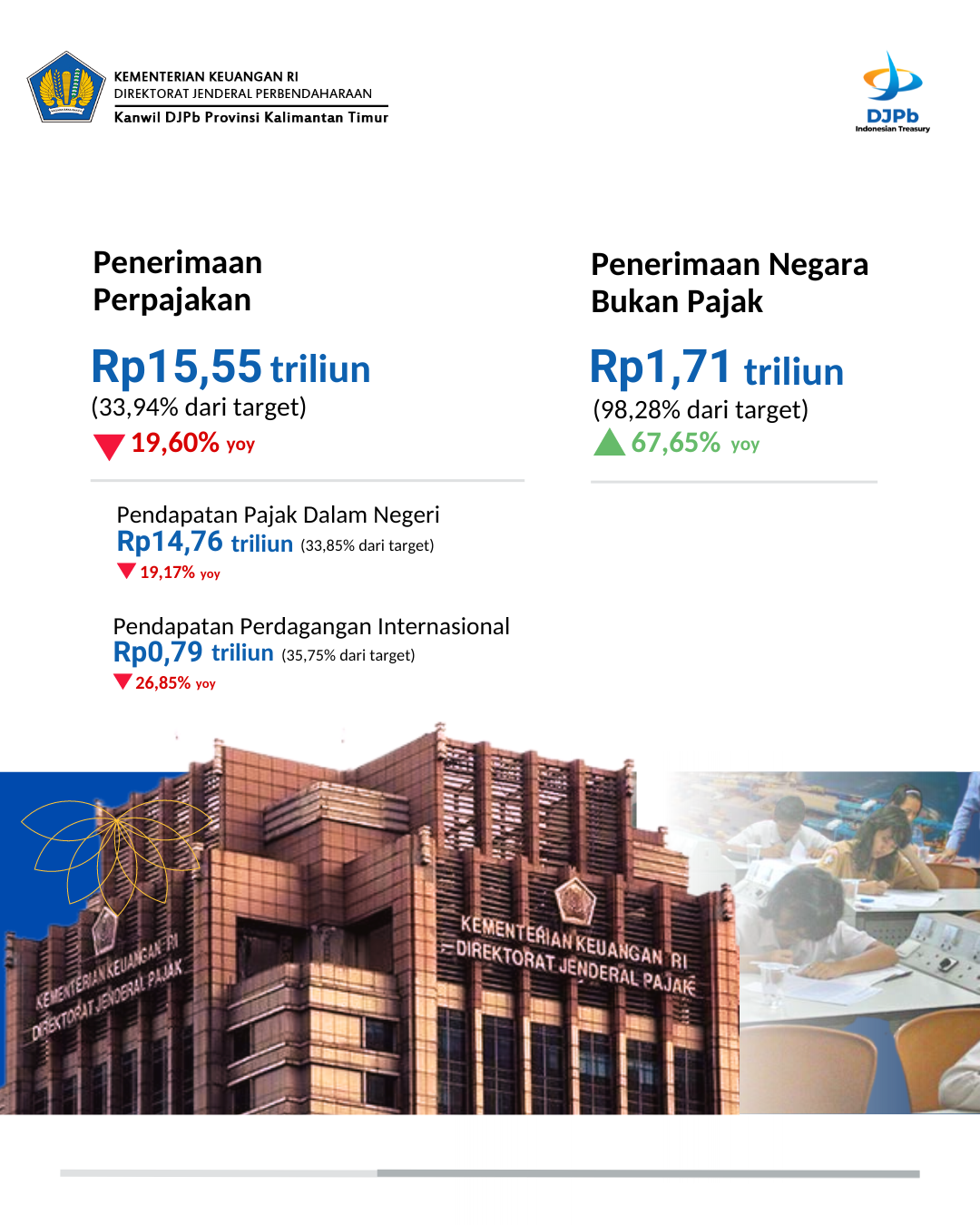 Penerimaan Perpajakan telah terealisasi sebesar Rp15,55 triliun (33,94% dari target). Capaian ini mengalami penurunan secara y-on-y. Penurunan tersebut disebabkan oleh turunnya harga komoditas, terutama batubara dan CPO, di pasar global dan pembayaran PPh Pasal 25/29 Badan.