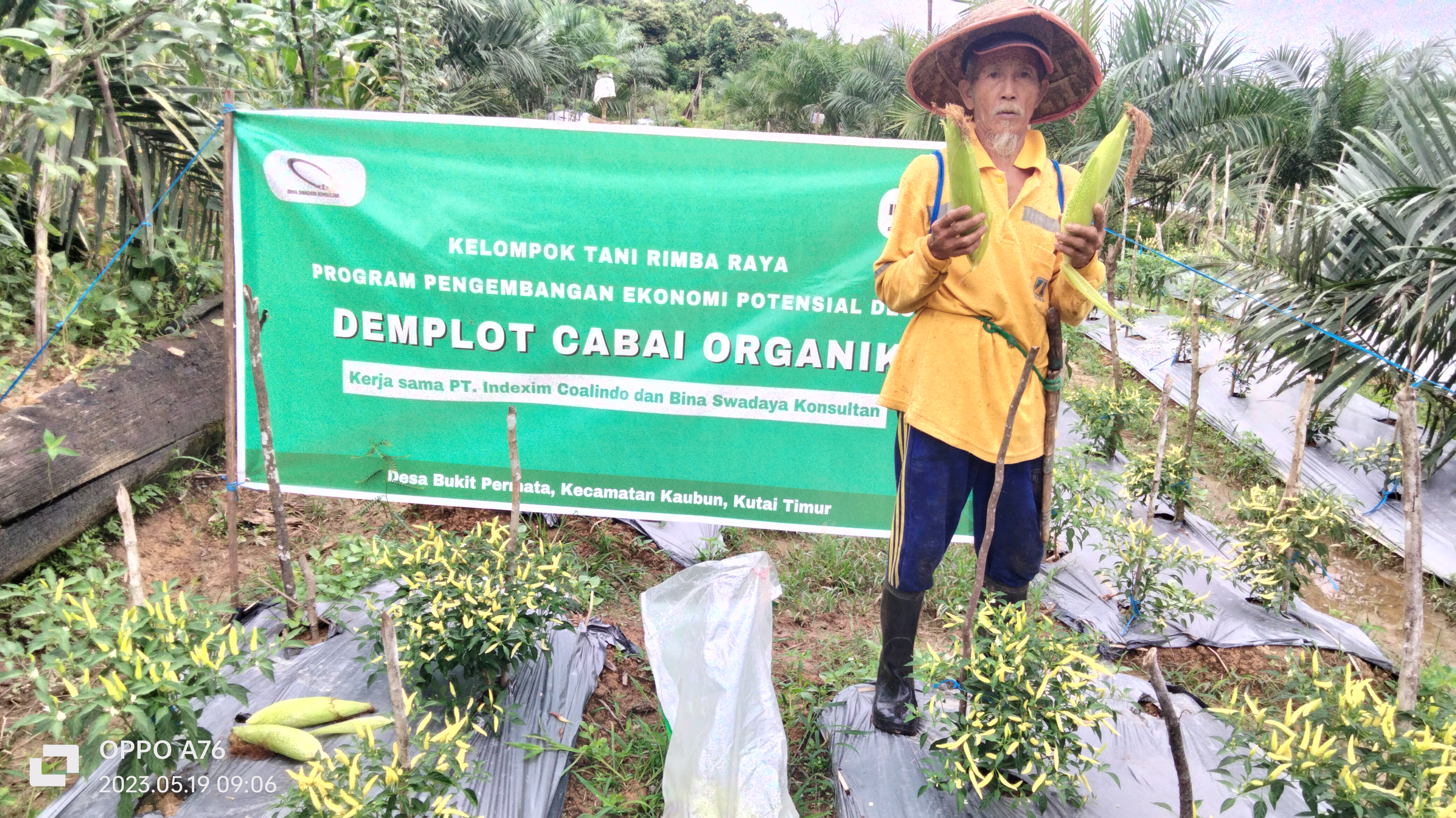 Masih di kecamatan yang sama, tepatnya di Desa Bukit Permata, tim pendamping PT Indexim Coalindo turut hadir dalam panen cabai yang dilakukan Kelompok Tani Rimba Raya. Kelompok tani yang terdiri dari 35 orang ini tadinya terbiasa menggunakan pupuk kimia dalam jumlah besar. Namun, selama proses pendampingan dan pengembangan demplot, PT Indexim Coalindo mendorong mereka mempraktikkan pertanian organik pada 1.000 pohon cabai.