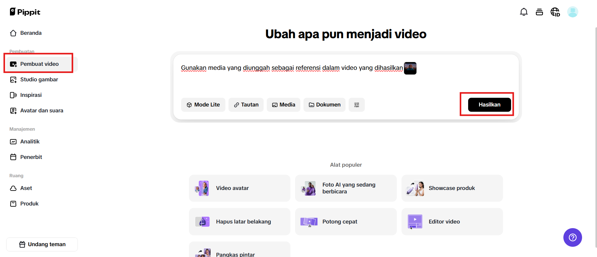 Mulailah dengan membuat akun Pippit, lalu masuk ke dashboard utama. Cari “Video generator” di menu kiri. Kamu punya dua opsi: masukkan link produk langsung ke kotak input, atau unggah file dari komputer dengan klik “Add media.”