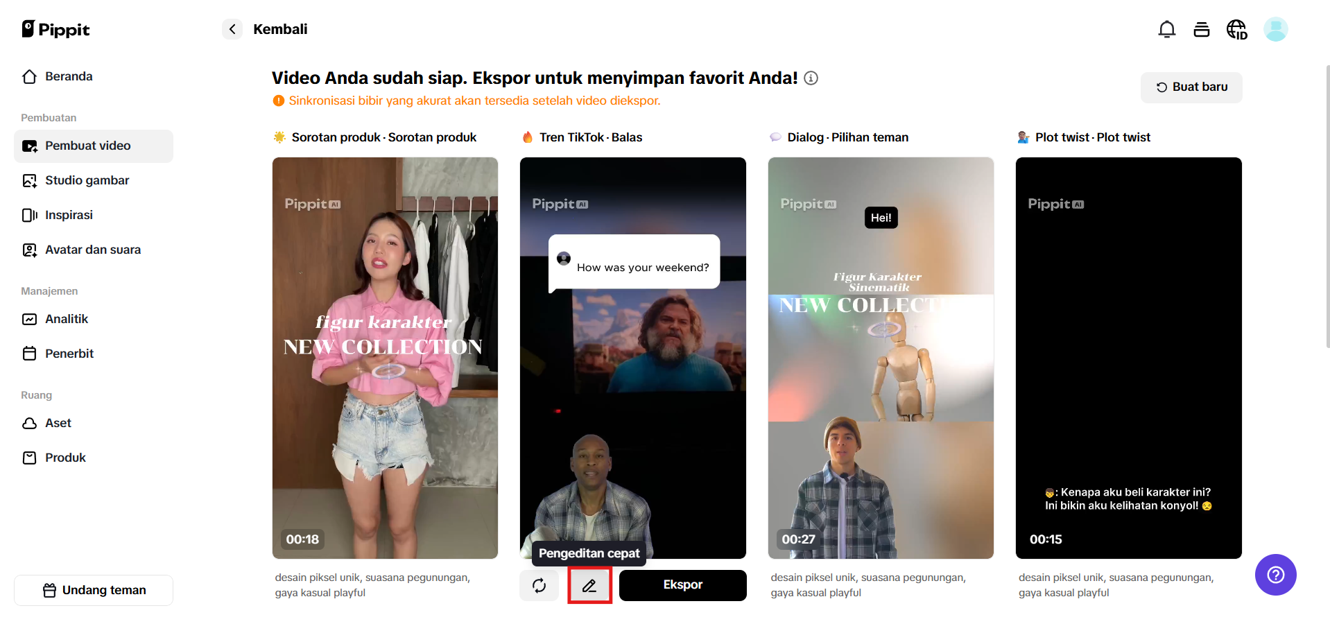 Lihat hasil yang sudah dibuat. Pilih opsi video yang paling sesuai. “Quick Edit” bisa untuk pengaturan dasar seperti gaya teks, skrip, atau voiceover. Kalau mau kontrol lebih detail, pilih “Edit More” untuk mengatur fokus topik, menambahkan efek suara, bermain dengan warna, atau detail visual lainnya.
