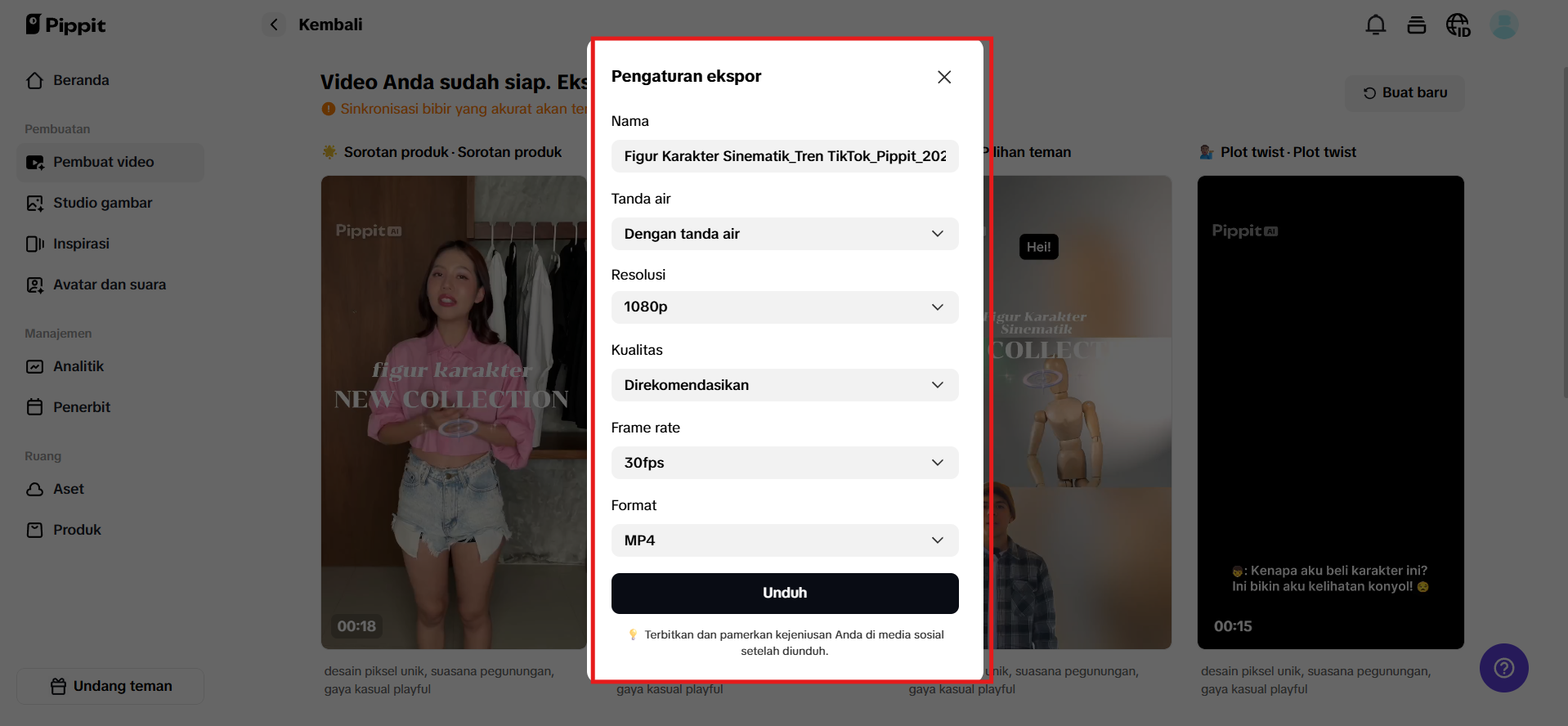 Sudah puas dengan hasilnya? Klik tombol “Export” di pojok kanan atas. “Download” menyimpan ke komputer—pilih resolusi, frame rate, kualitas, dan format sesuai kebutuhan, lalu klik “Export.”