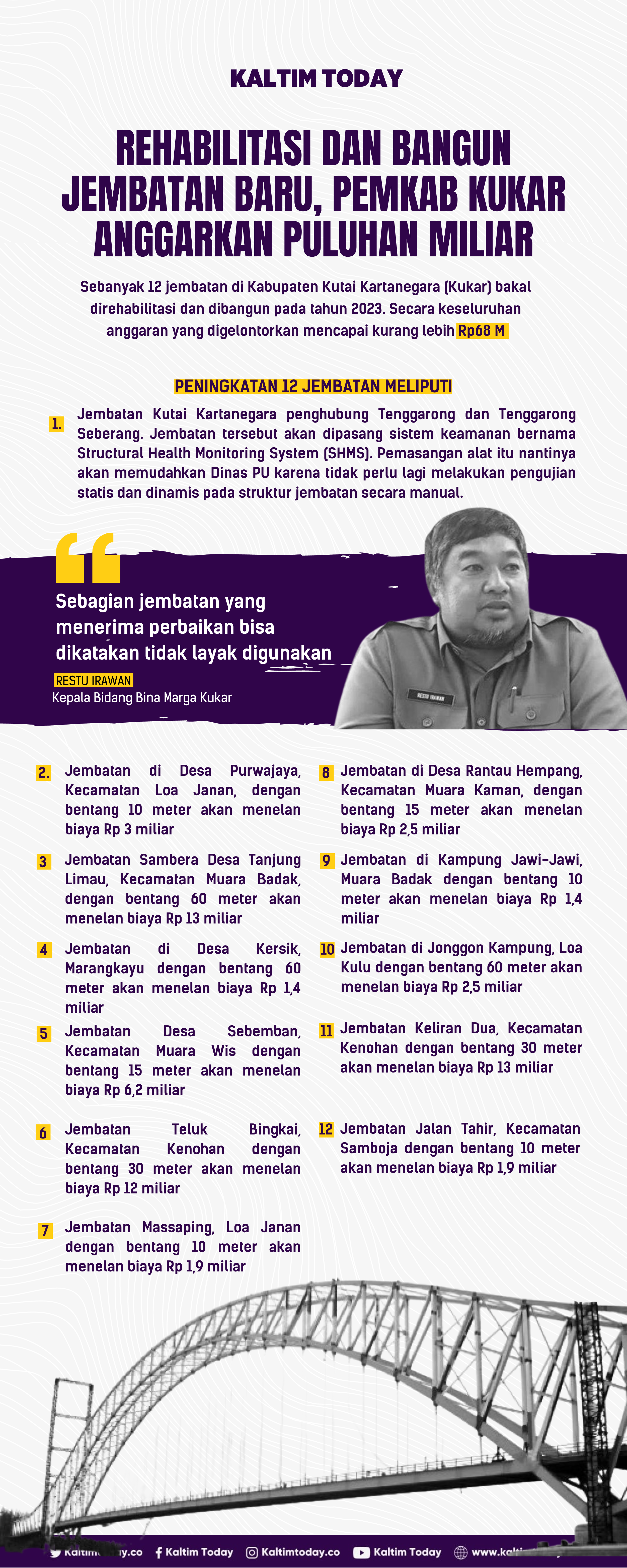 Kepala Bidang Bina Marga, Dinas Pekerjaan Umum Kukar, Restu Irawan menjelaskan, sebanyak tujuh jembatan akan direhabilitasi dan lima jembatan baru akan dibangun.