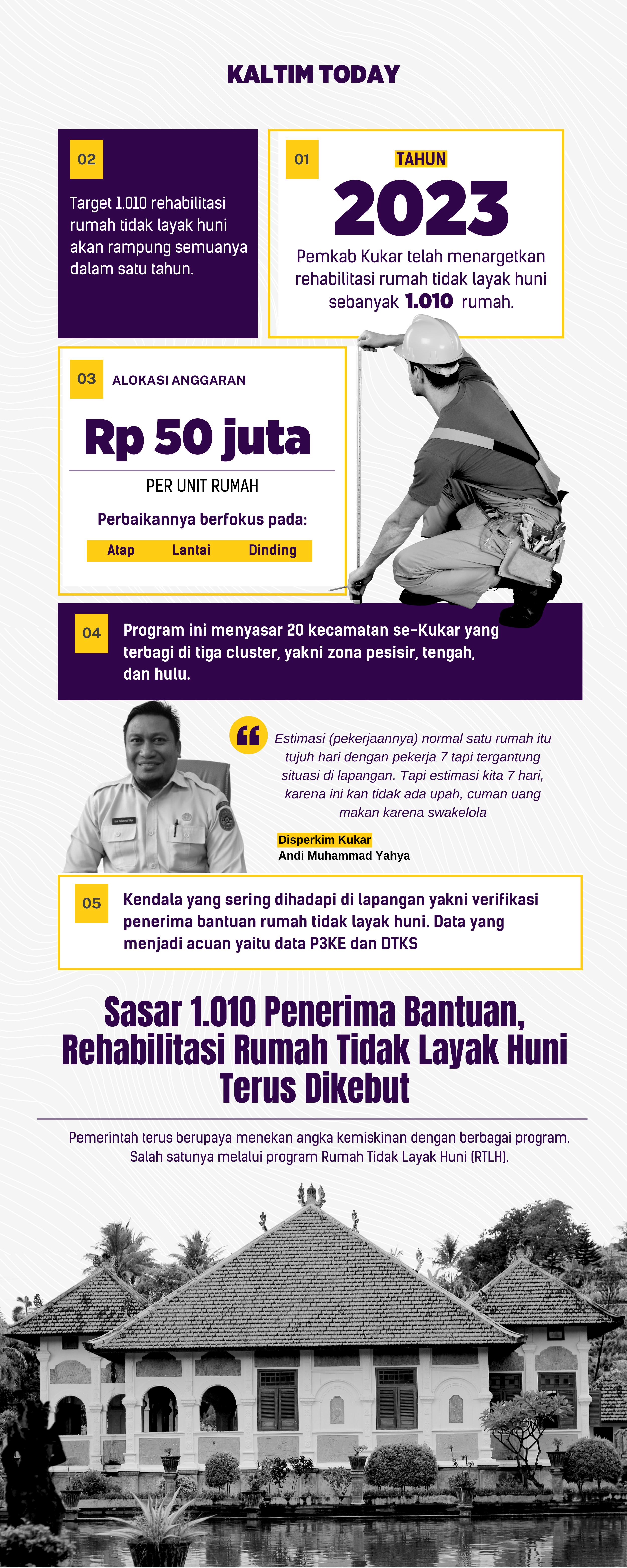 Tahun 2023, Pemerintah Kabupaten Kutai Kartanegara (Pemkab) telah menargetkan rehabilitasi rumah tidak layak huni sebanyak 1.010 rumah. Program ini menyasar 20 kecamatan se-Kukar yang terbagi di tiga cluster, yakni zona pesisir, tengah, dan hulu.